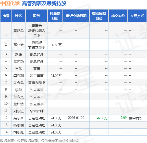 中国化学近半年内的董监高及核心技术人员增减持详情如下: