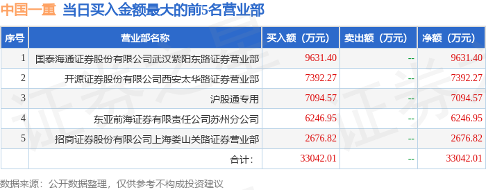 证券之星消息,沪深交易所2026年1月22日公布的交易公开信息显示,中国一重(601106)因有价格涨跌幅限制的日收盘价格涨幅偏离值达到7%的前五只证券登上龙虎榜。此次是近5个交易日内第2次上榜。