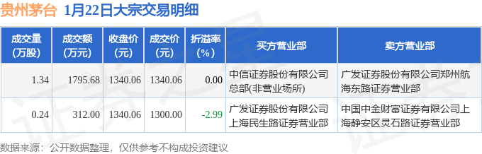 证券之星消息,1月22日贵州茅台发生大宗交易,交易数据如下: