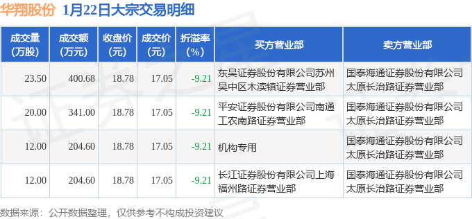 证券之星消息,1月22日华翔股份发生大宗交易,交易数据如下: