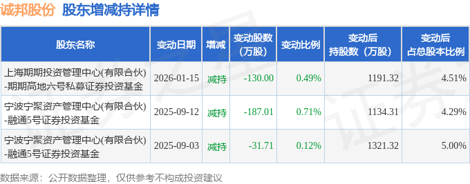 截至2026年1月22日收盘,诚邦股份(603316)报收于14.29元,上涨0.63%,换手率4.94%,成交量13.06万手,成交额1.86亿元。