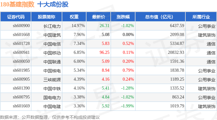 证券之星消息,1月22日,180基建(000025)指数报收于1759.47点,跌0.06%,成交345.26亿元,换手率0.85%。当日该指数成份股中,上涨的有15家,中国卫通以8.09%的涨幅领涨,下跌的有15家,中国电建以1.99%的跌幅领跌。