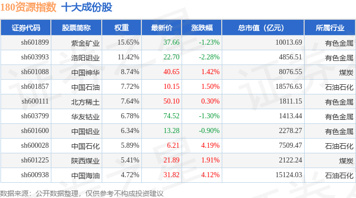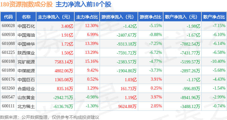 资金流向方面,180资源(000026)指数成份股当日主力资金净流出合计12.85亿元,游资资金净流出合计1.5亿元,散户资金净流入合计14.35亿元。成份股资金流向详情见下表: