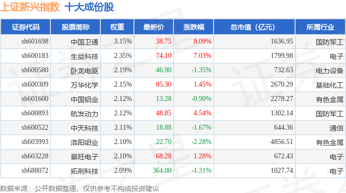 上证新兴(000067)指数十大成份股详情如下: