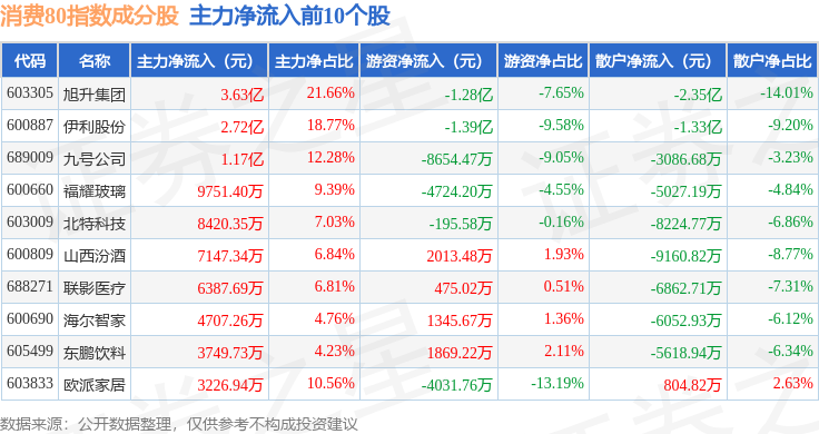 资金流向方面,消费80(000069)指数成份股当日主力资金净流出合计39.0亿元,游资资金净流入合计19.46亿元,散户资金净流入合计19.54亿元。成份股资金流向详情见下表:
