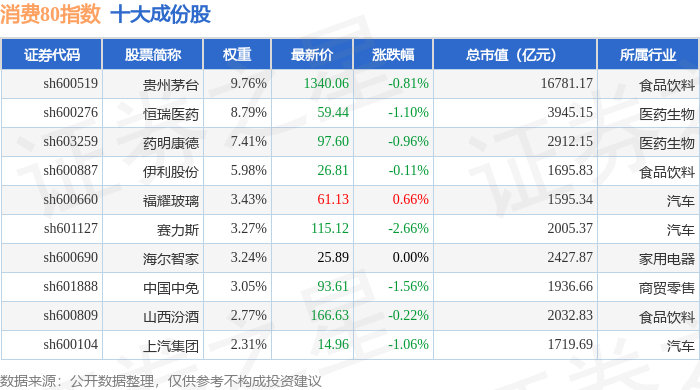 消费80(000069)指数十大成份股详情如下: