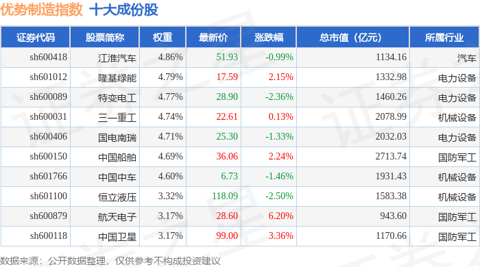 证券之星消息,1月22日,优势制造(000146)指数报收于8744.89点,涨0.62%,成交1232.9亿元,换手率2.99%。当日该指数成份股中,上涨的有30家,中国动力以7.3%的涨幅领涨,下跌的有19家,中国西电以3.62%的跌幅领跌。