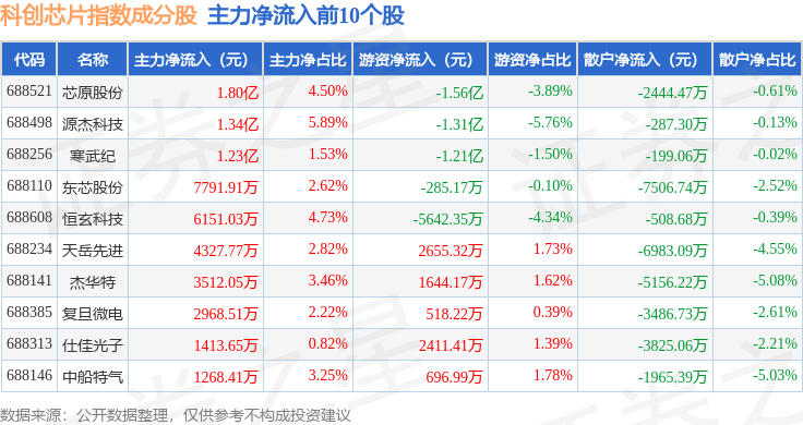 资金流向方面,科创芯片(000685)指数成份股当日主力资金净流出合计40.86亿元,游资资金净流入合计29.11亿元,散户资金净流入合计11.75亿元。成份股资金流向详情见下表: