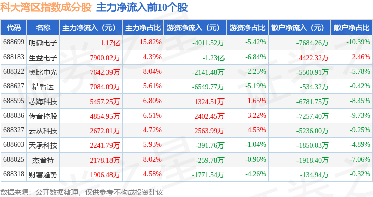 资金流向方面,科大湾区(000697)指数成份股当日主力资金净流出合计14.8亿元,游资资金净流入合计10.05亿元,散户资金净流入合计4.75亿元。成份股资金流向详情见下表: