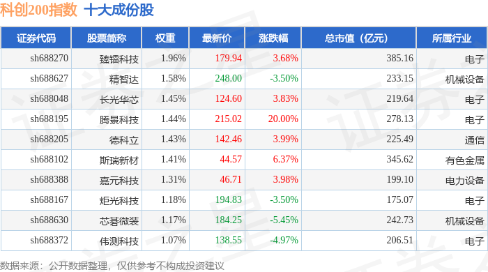 证券之星消息,1月22日,科创200(000699)指数报收于1549.32点,涨0.6%,成交851.83亿元,换手率3.59%。当日该指数成份股中,上涨的有95家,腾景科技以20.0%的涨幅领涨,下跌的有102家,艾迪药业以13.48%的跌幅领跌。