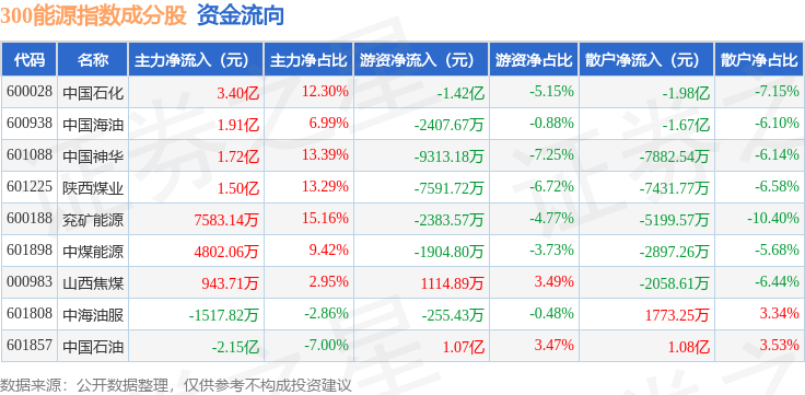 资金流向方面,300能源(000908)指数成份股当日主力资金净流入合计7.56亿元,游资资金净流出合计2.63亿元,散户资金净流出合计4.93亿元。成份股资金流向详情见下表: