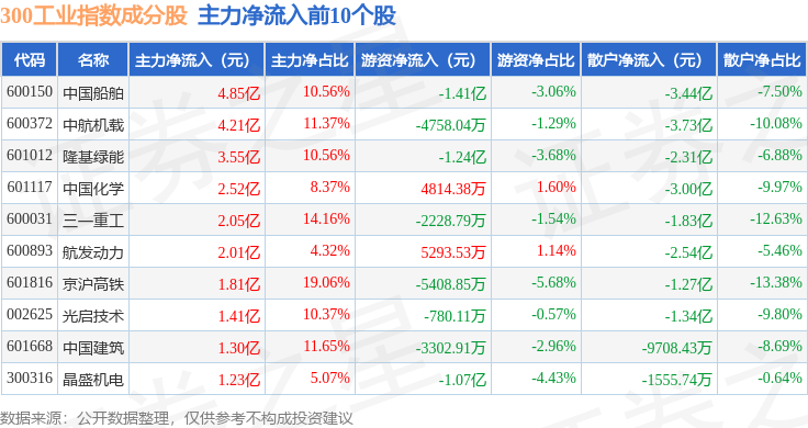 资金流向方面,300工业(000910)指数成份股当日主力资金净流出合计29.28亿元,游资资金净流入合计6.84亿元,散户资金净流入合计22.44亿元。成份股资金流向详情见下表: