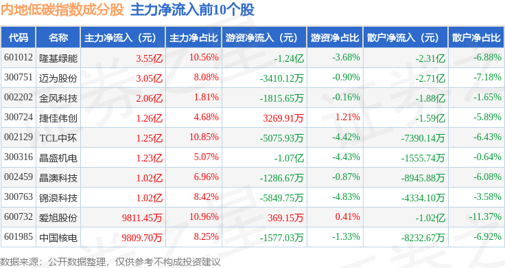 资金流向方面,内地低碳(000977)指数成份股当日主力资金净流出合计39.47亿元,游资资金净流入合计5.56亿元,散户资金净流入合计33.74亿元。成份股资金流向详情见下表: