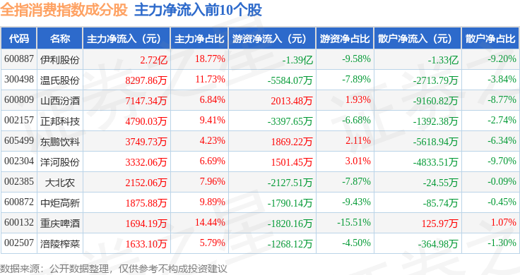 资金流向方面,全指消费(000990)指数成份股当日主力资金净流出合计10.15亿元,游资资金净流入合计3.82亿元,散户资金净流入合计6.33亿元。成份股资金流向详情见下表: