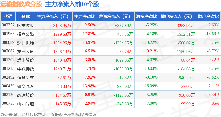 资金流向方面,运输指数(399237)成份股当日主力资金净流出合计4194.3万元,游资资金净流出合计1.88亿元,散户资金净流入合计2.3亿元。成份股资金流向详情见下表: