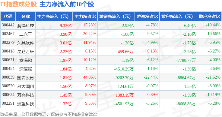 资金流向方面,IT指数(399239)成份股当日主力资金净流入合计21.98亿元,游资资金净流出合计5.34亿元,散户资金净流出合计16.64亿元。成份股资金流向详情见下表: