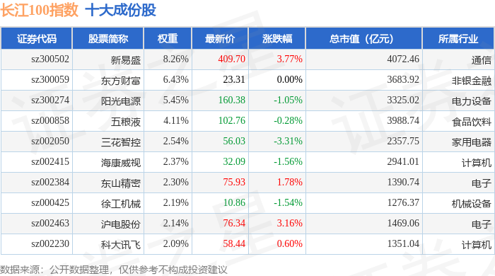 证券之星消息,1月22日,长江100(399278)指数报收于2253.67点,涨0.33%,成交2060.42亿元,换手率2.07%。当日该指数成份股中,上涨的有50家,迈为股份以9.61%的涨幅领涨,下跌的有49家,三花智控以3.31%的跌幅领跌。