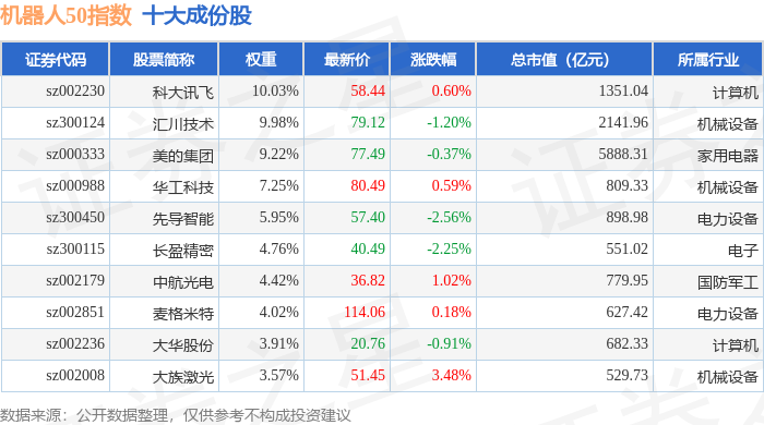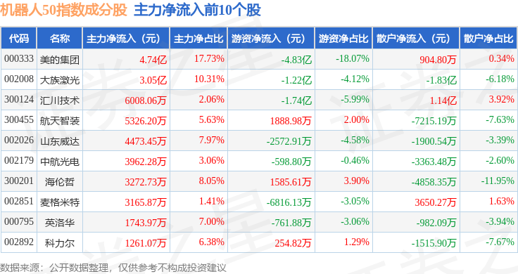 资金流向方面,机器人50(399283)指数成份股当日主力资金净流出合计11.47亿元,游资资金净流出合计4.17亿元,散户资金净流入合计15.64亿元。成份股资金流向详情见下表: