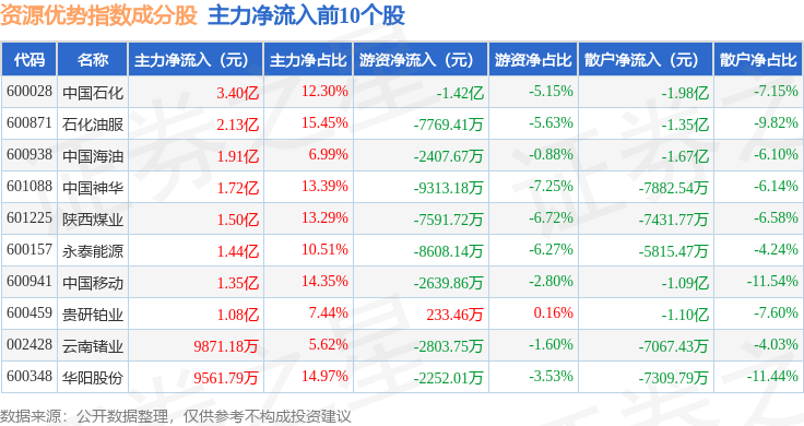 资金流向方面,资源优势(399319)指数成份股当日主力资金净流出合计41.07亿元,游资资金净流入合计11.22亿元,散户资金净流入合计29.85亿元。成份股资金流向详情见下表: