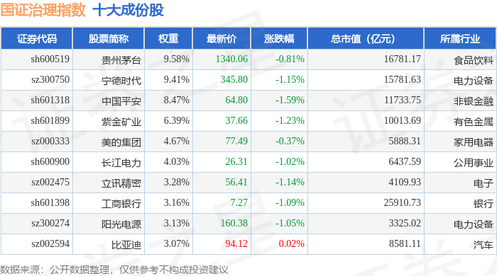 国证治理(399322)指数十大成份股详情如下: