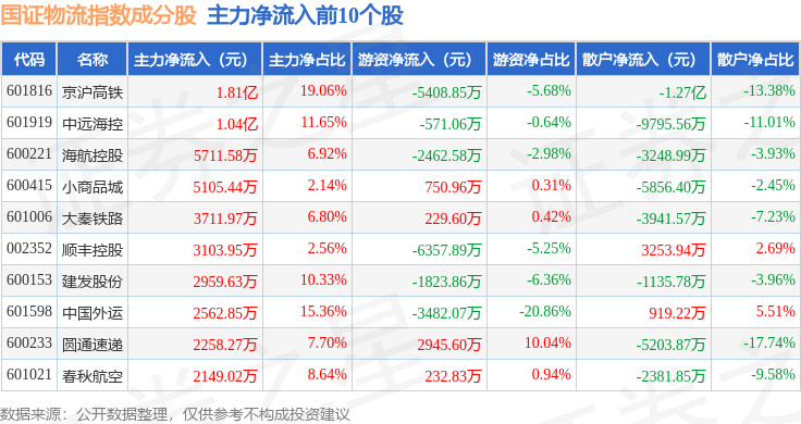 资金流向方面,国证物流(399353)指数成份股当日主力资金净流出合计1236.72万元,游资资金净流出合计5598.88万元,散户资金净流入合计6835.61万元。成份股资金流向详情见下表: