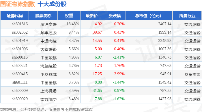 国证物流(399353)指数十大成份股详情如下: