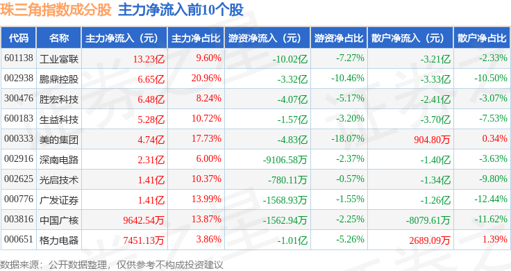 资金流向方面,珠三角(399356)指数成份股当日主力资金净流出合计2.05亿元,游资资金净流出合计25.69亿元,散户资金净流入合计27.74亿元。成份股资金流向详情见下表: