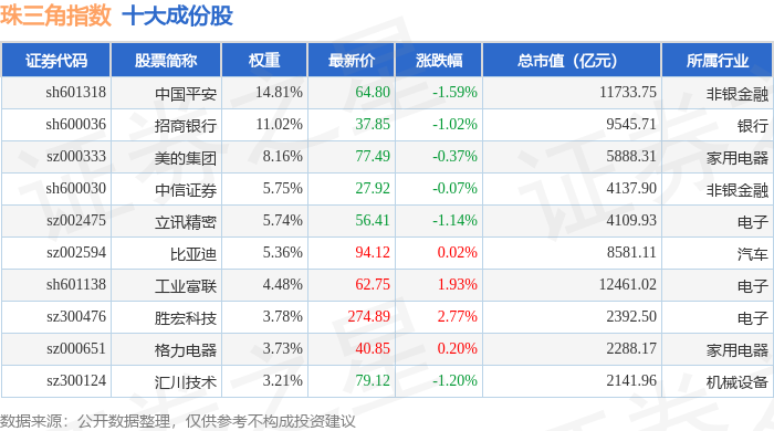 珠三角(399356)指数十大成份股详情如下: