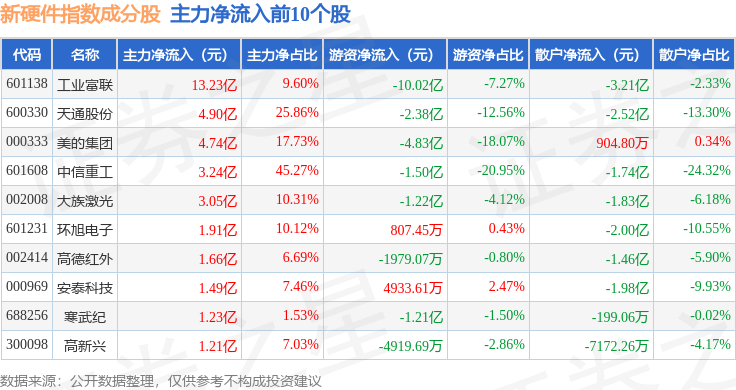 资金流向方面,新硬件(399360)指数成份股当日主力资金净流出合计31.06亿元,游资资金净流入合计1.72亿元,散户资金净流入合计29.34亿元。成份股资金流向详情见下表: