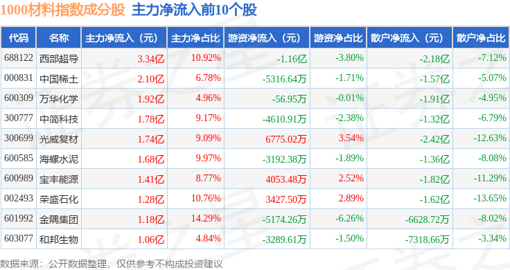 资金流向方面,1000材料(399382)指数成份股当日主力资金净流出合计43.32亿元,游资资金净流入合计20.57亿元,散户资金净流入合计22.75亿元。成份股资金流向详情见下表: