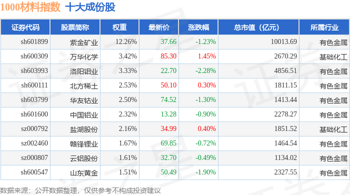 证券之星消息,1月22日,1000材料(399382)指数报收于4328.02点,涨0.42%,成交1942.51亿元,换手率2.59%。当日该指数成份股中,上涨的有98家,金隅集团以10.22%的涨幅领涨,下跌的有33家,江西铜业以3.04%的跌幅领跌。