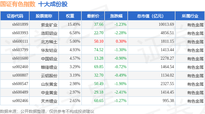 证券之星消息,1月22日,国证有色(399395)指数报收于11224.95点,跌0.76%,成交1057.63亿元,换手率2.69%。当日该指数成份股中,上涨的有19家,白银有色以10.04%的涨幅领涨,下跌的有29家,西部黄金以3.99%的跌幅领跌。