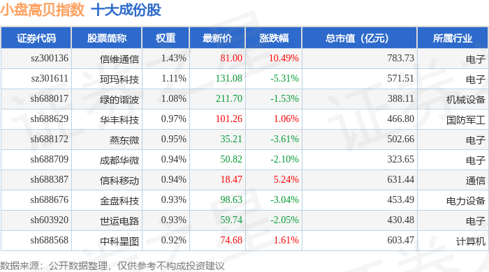 小盘高贝(399409)指数十大成份股详情如下: