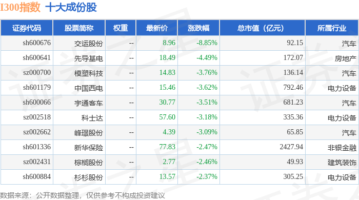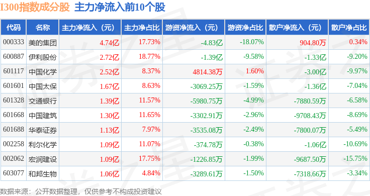 资金流向方面,I300(399416)指数成份股当日主力资金净流出合计47.74亿元,游资资金净流出合计2.96亿元,散户资金净流入合计50.7亿元。成份股资金流向详情见下表: