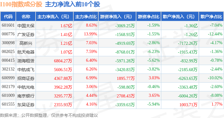 资金流向方面,I100(399415)指数成份股当日主力资金净流出合计34.58亿元,游资资金净流出合计1.87亿元,散户资金净流入合计36.45亿元。成份股资金流向详情见下表: