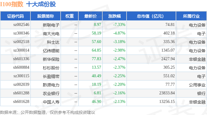 证券之星消息,1月22日,I100(399415)指数报收于7919.87点,涨0.03%,成交1474.11亿元,换手率0.6%。当日该指数成份股中,上涨的有55家,奥康国际以9.84%的涨幅领涨,下跌的有36家,新联电子以7.33%的跌幅领跌。