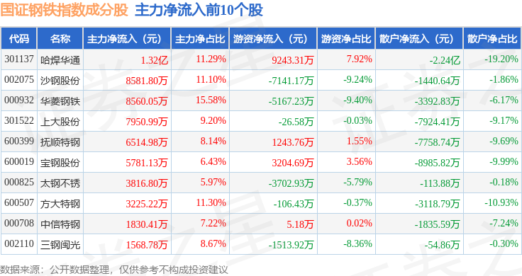 资金流向方面,国证钢铁(399440)指数成份股当日主力资金净流出合计26.67万元,游资资金净流入合计1.71亿元,散户资金净流出合计1.7亿元。成份股资金流向详情见下表: