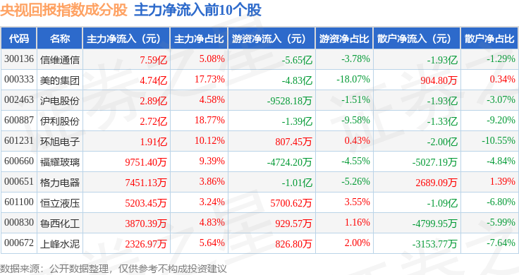 资金流向方面,央视回报(399553)指数成份股当日主力资金净流出合计2.86亿元,游资资金净流入合计1.59亿元,散户资金净流入合计1.27亿元。成份股资金流向详情见下表: