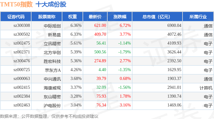 TMT50(399610)指数十大成份股详情如下: