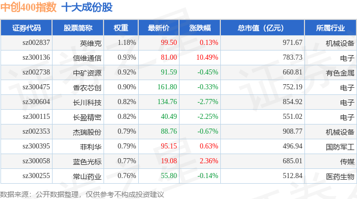 中创400(399624)指数十大成份股详情如下: