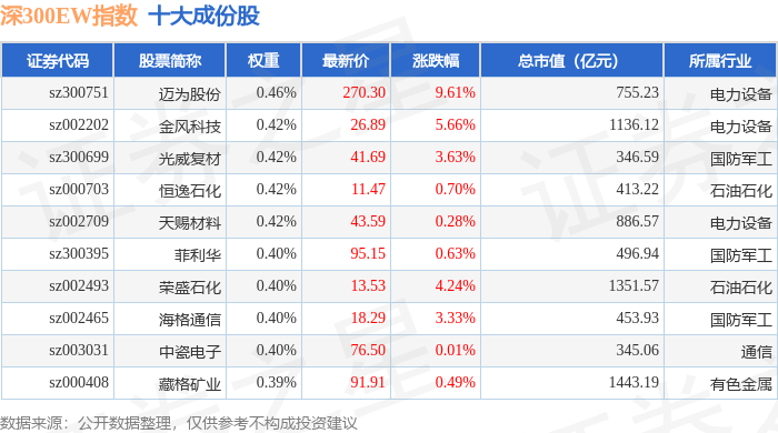 深300EW(399633)指数十大成份股详情如下: