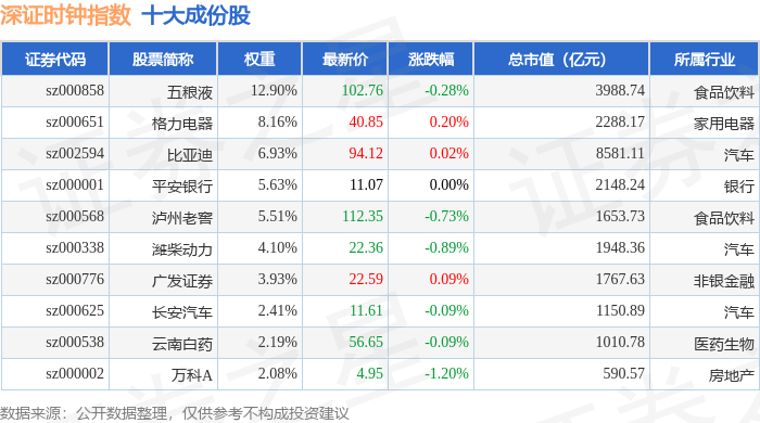 深证时钟(399644)指数十大成份股详情如下: