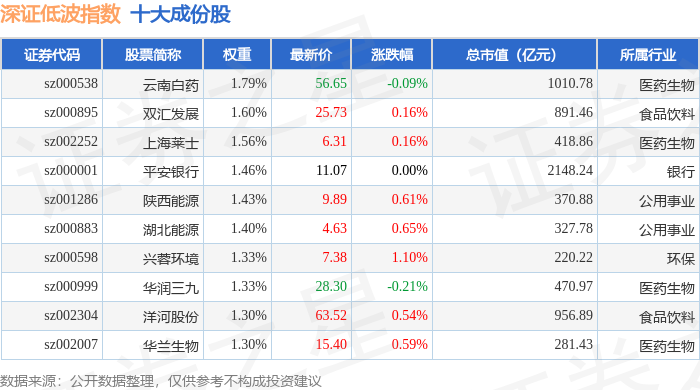 深证低波(399661)指数十大成份股详情如下: