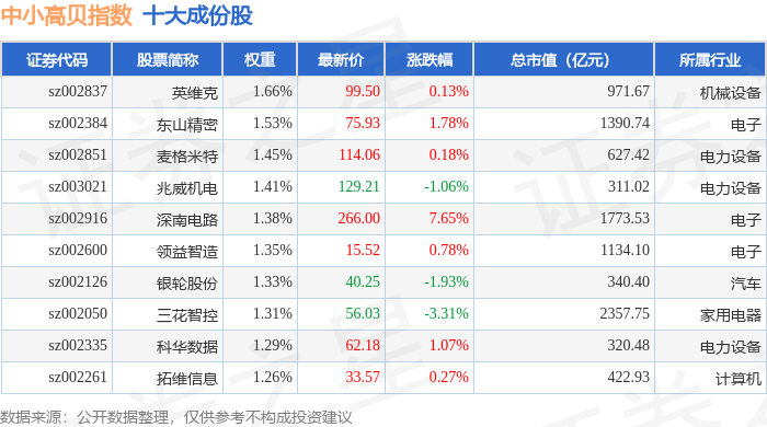 证券之星消息,1月22日,中小高贝(399664)指数报收于1628.07点,涨0.36%,成交1652.24亿元,换手率4.13%。当日该指数成份股中,上涨的有55家,崇达技术以10.03%的涨幅领涨,下跌的有45家,利欧股份以10.04%的跌幅领跌。