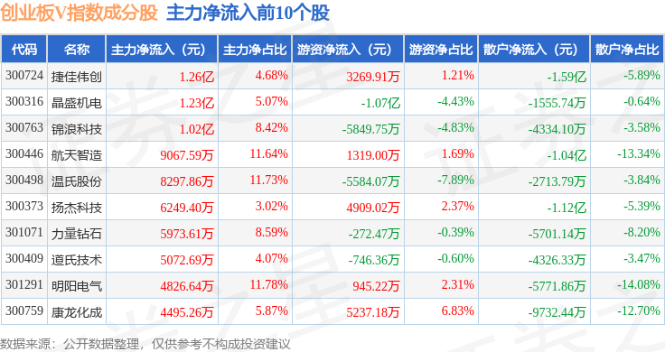 资金流向方面,创业板V(399668)指数成份股当日主力资金净流出合计51.33亿元,游资资金净流入合计10.9亿元,散户资金净流入合计40.42亿元。成份股资金流向详情见下表: