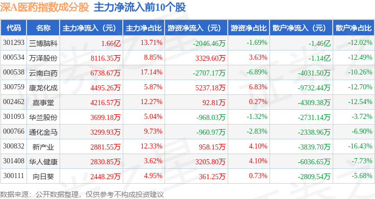 资金流向方面,深A医药(399674)指数成份股当日主力资金净流出合计13.21亿元,游资资金净流入合计1.74亿元,散户资金净流入合计11.47亿元。成份股资金流向详情见下表: