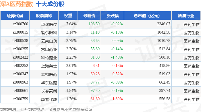 深A医药(399674)指数十大成份股详情如下: