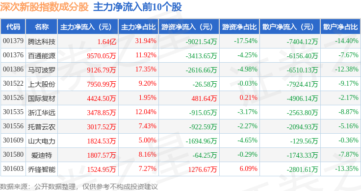 资金流向方面,深次新股(399678)指数成份股当日主力资金净流出合计7.54亿元,游资资金净流入合计2.51亿元,散户资金净流入合计5.03亿元。成份股资金流向详情见下表: