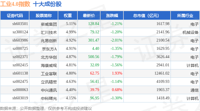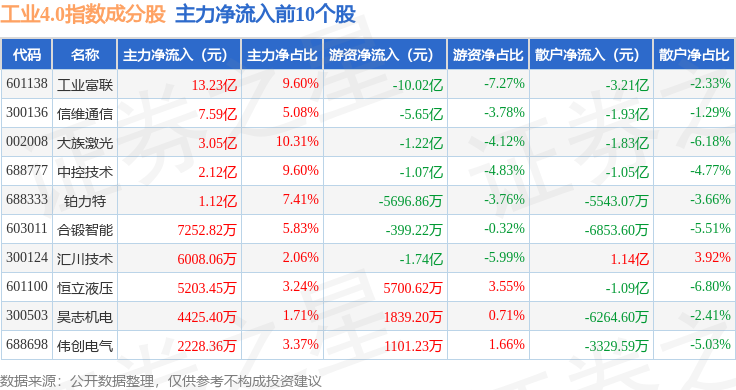 资金流向方面,工业4.0(399803)指数成份股当日主力资金净流出合计36.89亿元,游资资金净流入合计3.64亿元,散户资金净流入合计33.02亿元。成份股资金流向详情见下表: