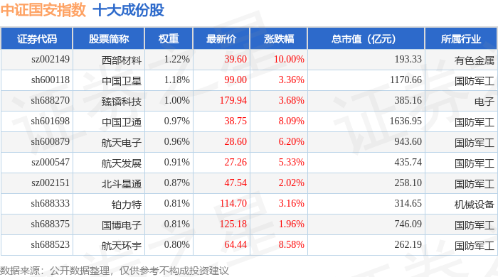 证券之星消息,1月22日,中证国安(399813)指数报收于8955.89点,涨2.7%,成交2276.72亿元,换手率4.85%。当日该指数成份股中,上涨的有126家,深信服以20.0%的涨幅领涨,下跌的有24家,浩云科技以3.66%的跌幅领跌。